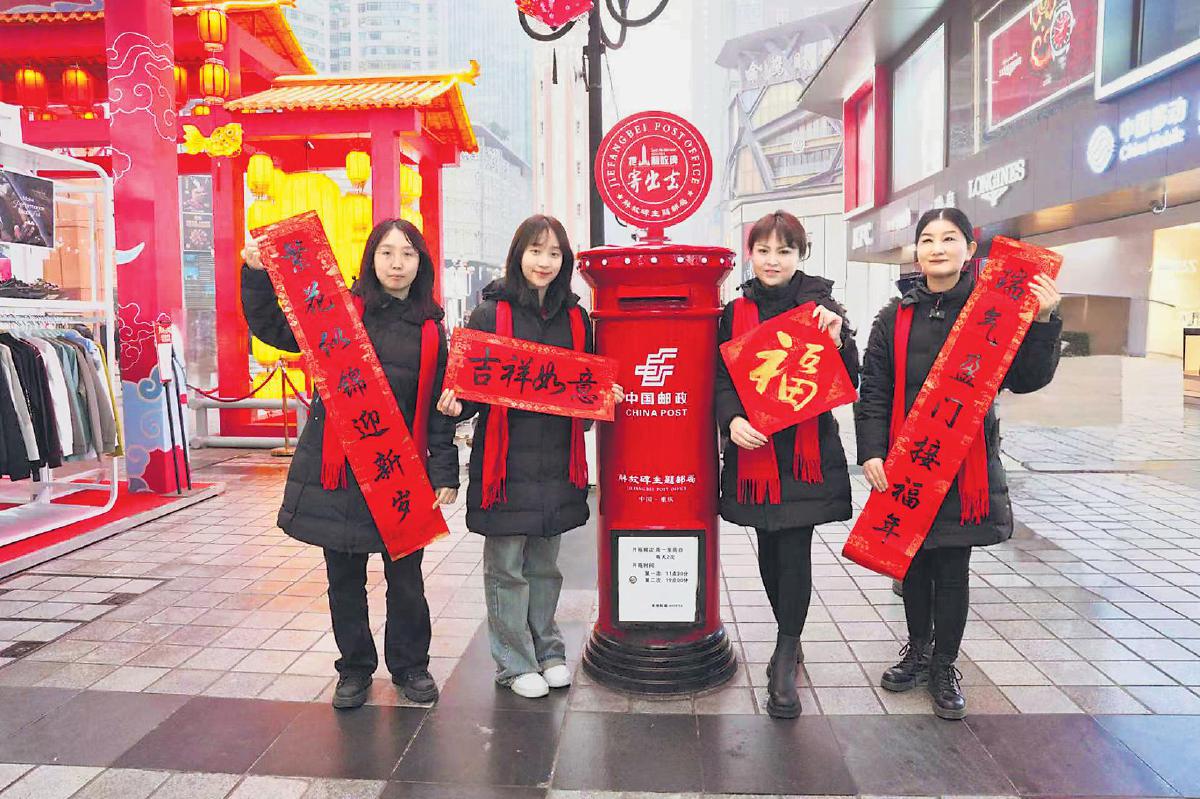 新春來臨,重慶市解放碑主題郵局張燈結(jié)彩,紅火的裝飾與整個商圈的喜慶氛圍相得益彰,向游人們述說著郵政與城市的不解之緣。