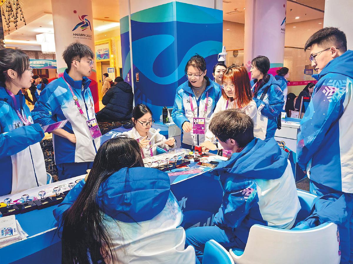 亞冬會(huì)志愿者在北大荒運(yùn)動(dòng)員村主題郵局打卡留念。□吳曉天 攝