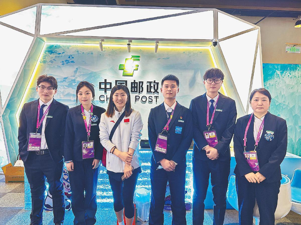 中國雪上項(xiàng)目首位全滿貫獲得者、本屆亞冬會(huì)自由式滑雪女子空中技巧項(xiàng)目冠軍徐夢桃(左三)在雅旺斯主題郵局郵寄包裹后,與郵政員工合影留念。□倪世雄 攝