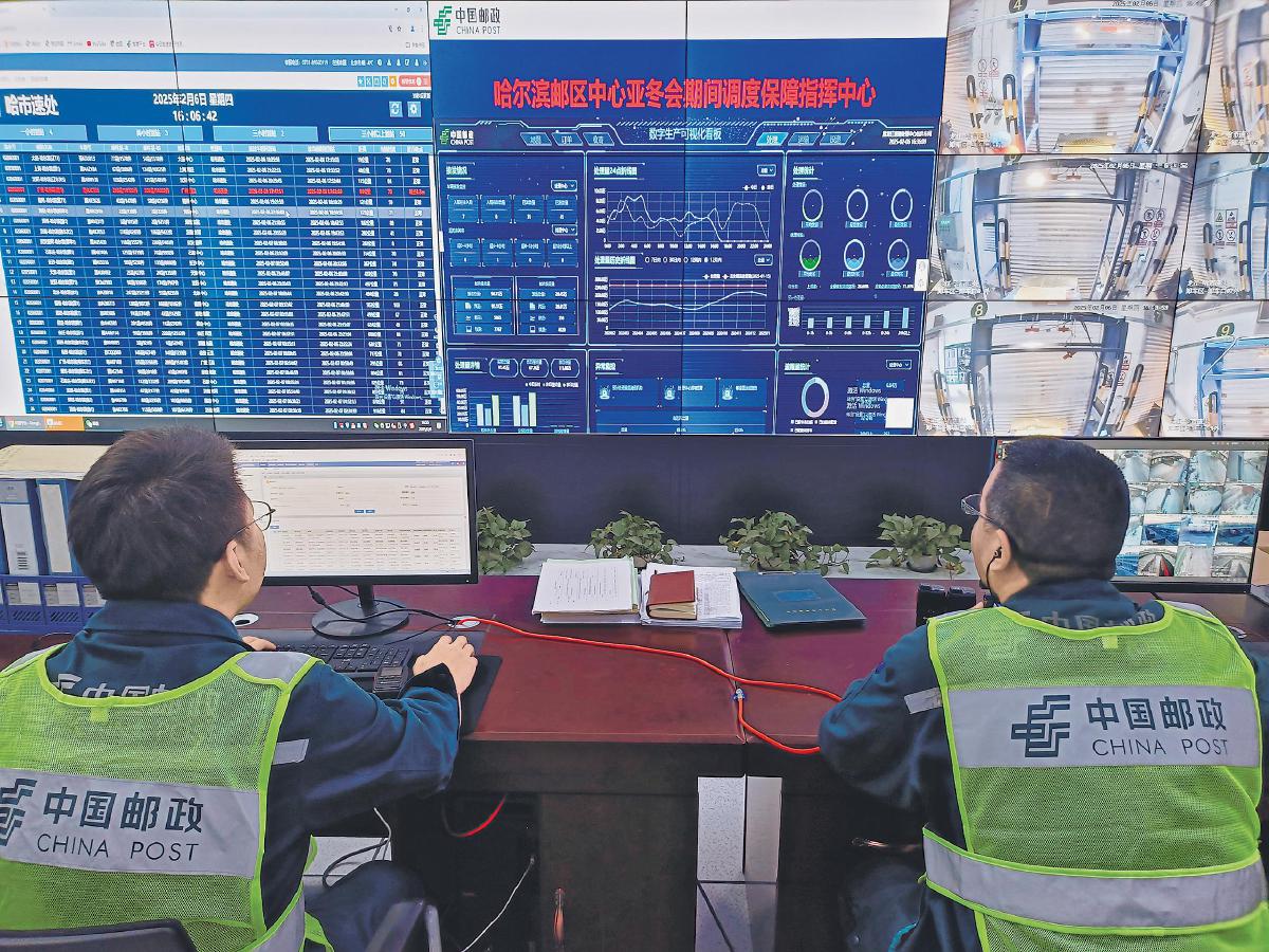 郵政工作人員在監(jiān)控室護(hù)航亞冬會(huì)郵件安全。□羅輝 攝