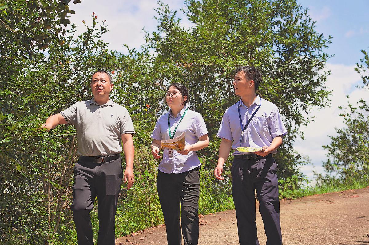 梅州市分行信貸員跟隨客戶查看農作物生長情況。