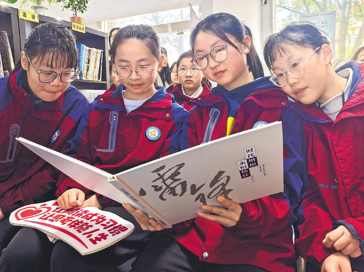 海門區分公司借助郵票這一載體,深入講解雷鋒的生平事跡與雷鋒精神的內涵、雷鋒主題郵票的歷史以及郵票所承載的文化與教育意義,并探討了在新時代如何傳承雷鋒精神等話題。圖為能仁中學學生在翻閱雷鋒主題郵冊。