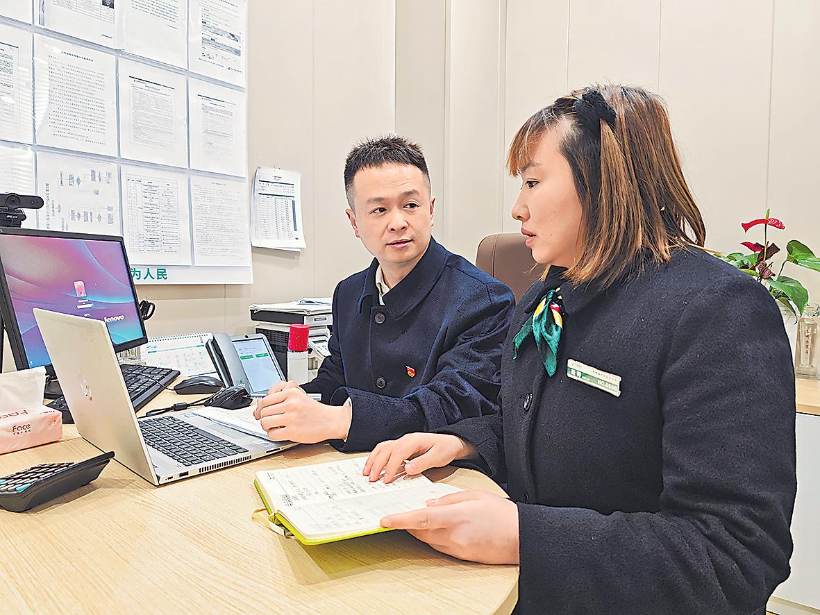 蔣源(左)指導理財經理為客戶制定理財方案?!鹾辍z