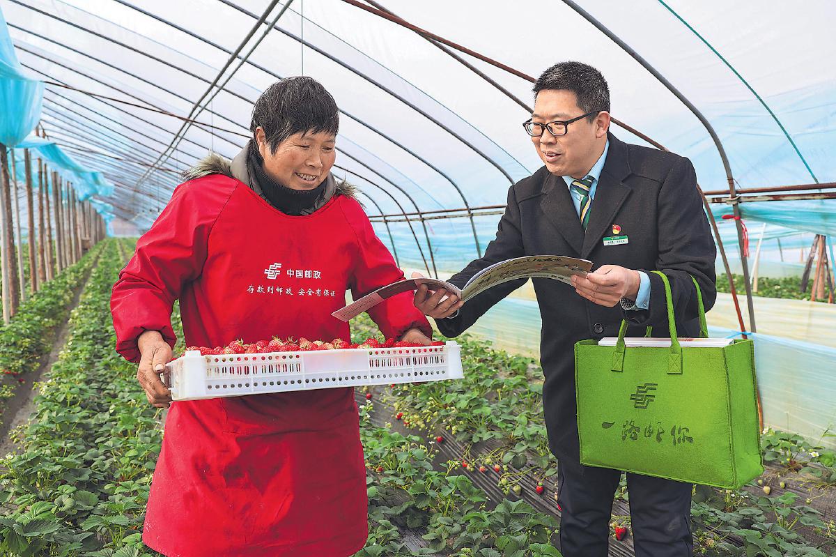眼下正是草莓上市的關(guān)鍵時期,湖北省襄陽市郵政分公司主動做好“三農(nóng)”服務(wù),聚焦草莓產(chǎn)業(yè)鏈發(fā)展,聯(lián)合當(dāng)?shù)剜]儲銀行提供惠農(nóng)貸款、銷售、寄遞等一條龍服務(wù),并于日前啟動草莓同城配送項目,規(guī)劃生鮮寄遞專門運輸線路,助力特色農(nóng)業(yè)產(chǎn)業(yè)發(fā)展壯大。圖為3月5日,襄陽郵政工作人員走進大棚,向種植戶宣講郵政服務(wù)舉措。