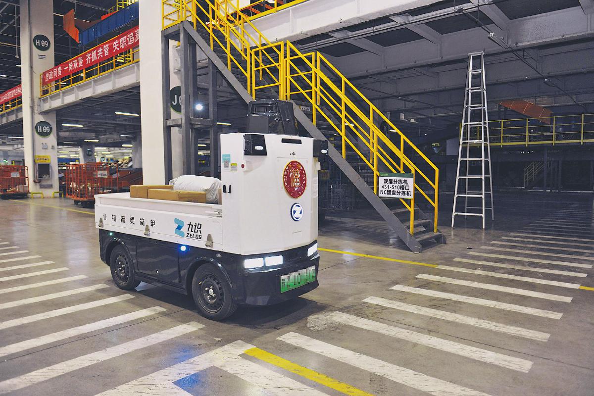 從窄帶區格口到最遠的裝車垛口差不多有200米距離,一名熟練的分揀員推著裝滿郵件的沉重籠車走完一趟至少用10分鐘,而無人盤駁車完成同等強度的工作只需要6分鐘。“籠車本身的自重就很重,裝滿郵件后要想推動它就變得比較困難,有時候就得兩個人一起推,導致分揀線上人手更加緊張。郵件還會遮擋視線,籠車撞到柱子上的事情也時有發生。無人盤駁車的運行很好地解決了這些問題。只要分揀員用手機里的小程序下達指令,無人盤駁車就可以不知疲倦地穿梭往來于格口和垛口之間,有效節省了人力成本。”胡凱說。