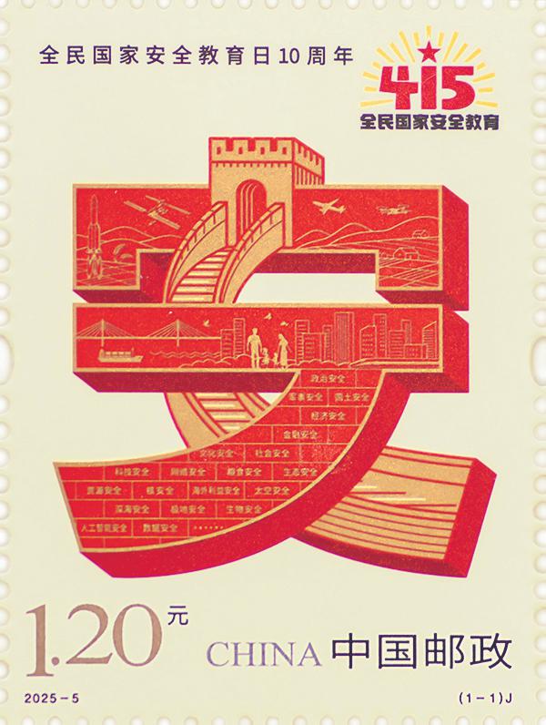 該郵票圖案采用醒目、莊重的紅金配色為主色調,以漢字“安”與安居樂業的人民、意象化的長城、城鄉建筑、麥穗、火箭、飛機、高鐵等元素進行同構設計,構成一幅社會穩定繁榮的美好畫面,同時融入全民國家安全教育標識圖案,體現出大安全理念和國家安全教育主題。國家安全目前所涉及的多個重點領域采用一塊塊磚石壘砌,寓意總體國家安全觀內涵豐富,象征著新時代國家安全堅如磐石。郵票印制細節清晰自然,圖中金字采用鏤空套印,既確保金字的飽滿明亮,也大幅提升批量印刷的穩定性。紫外燈下,紅墨呈現鮮艷紅熒光效果,層次分明,增強了郵票的防偽性與觀賞性。