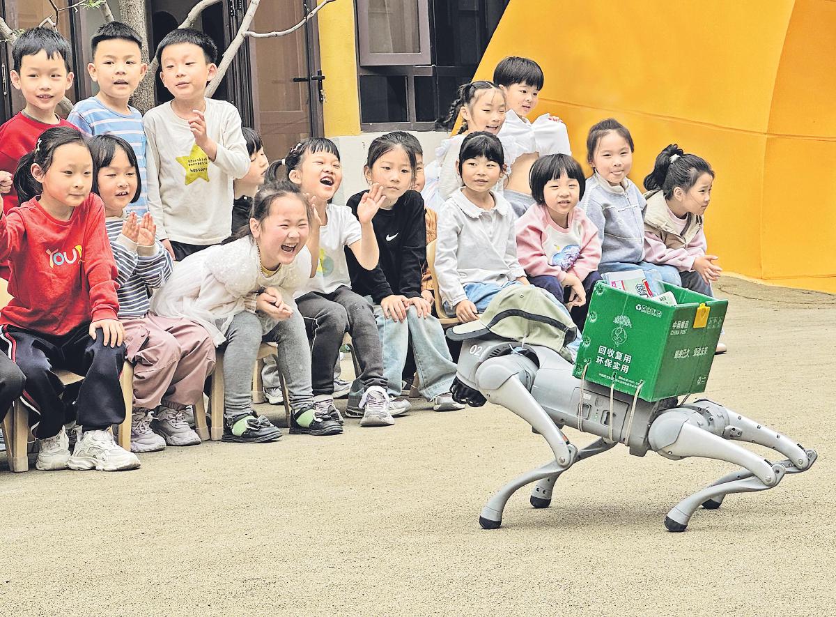小朋友通過“小小郵遞員”“小小銀行家”等角色扮演,與機(jī)器狗互動(dòng),體驗(yàn)送報(bào)、送信、送快遞,學(xué)習(xí)認(rèn)識(shí)錢幣等知識(shí)。現(xiàn)場(chǎng)還設(shè)立了集郵文創(chuàng)產(chǎn)品、幼兒畫報(bào)圖書展示區(qū),吸引了眾多師生前來打卡。圖為“郵小驛”機(jī)器狗一出場(chǎng)就獲得小朋友喝彩。