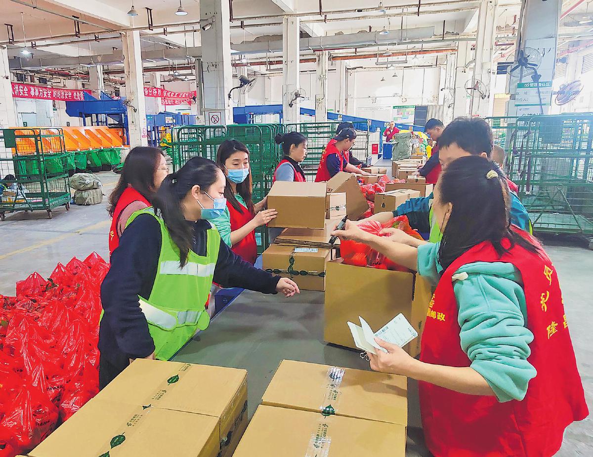 工作人員在隆昌郵政郵件處理中心包裝發(fā)運沃柑。 □袁潞 攝