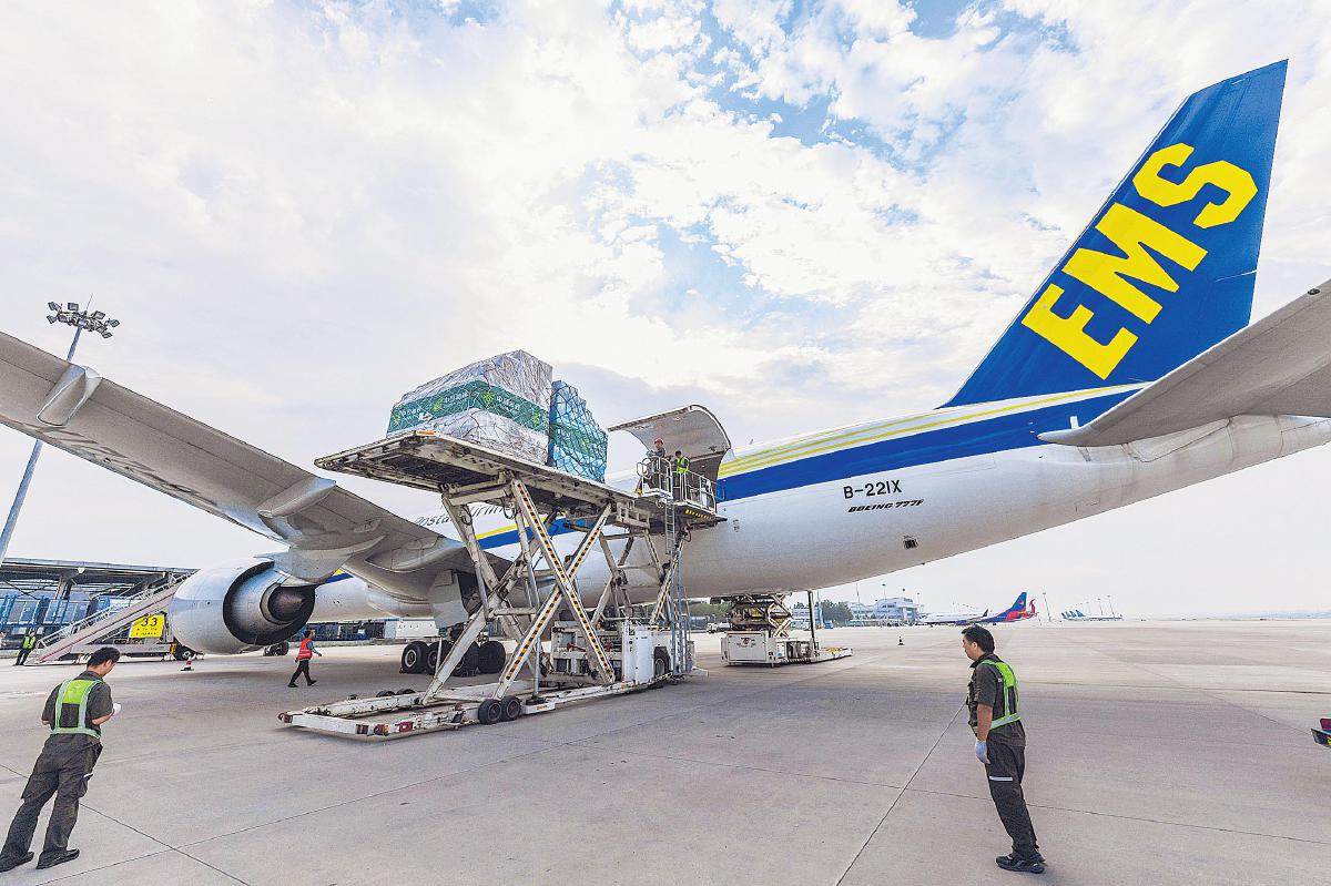 “鄭州—盧森堡”航線首班承運航班CF257在裝載貨物。 □張晨昱 攝