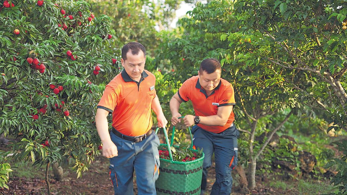 郵政員工在荔枝園里幫助果農(nóng)搬運(yùn)荔枝。