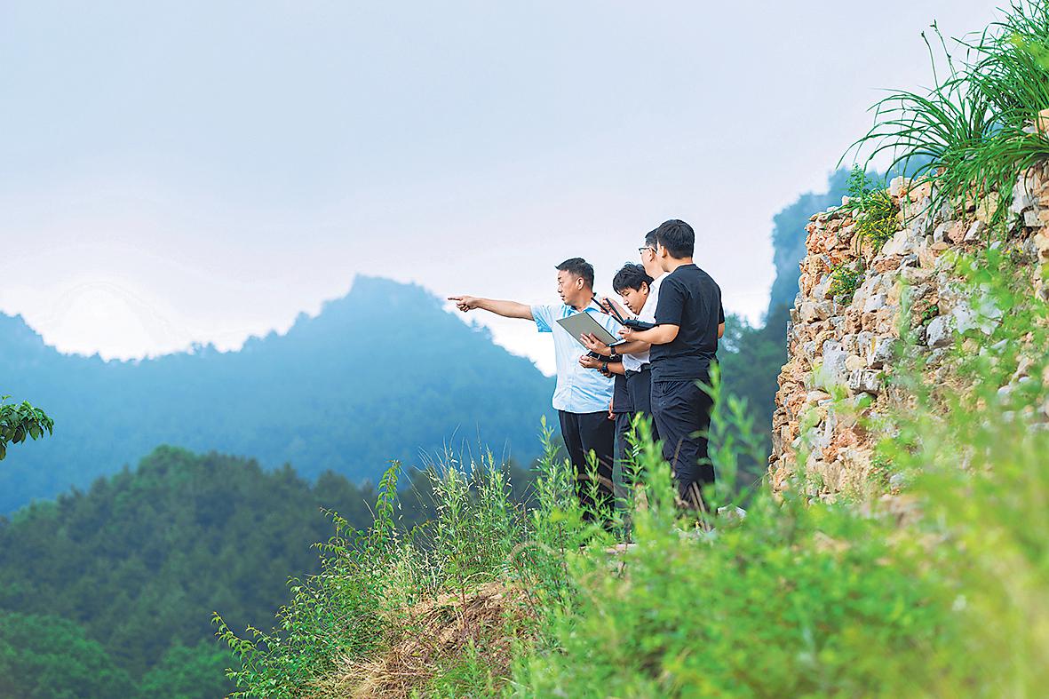 林州郵政工作人員與技術員在大垴村考察無人機起降點。