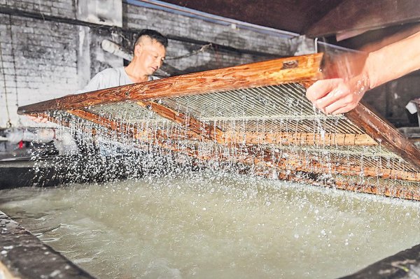 見到曹建勤時,他正挽起袖子,將一張竹簾沉進漿槽又緩緩提起,手腕輕晃幾下,簾面便勻開半透明的云絮。這是宣紙制作中極為重要的一環——撈紙。