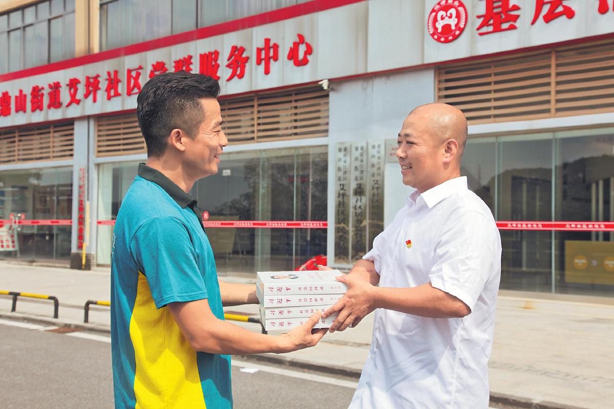 重慶市郵政分公司通過網點重點展示和視頻聯播宣傳,確保重大主題圖書發行工作高效推進。圖為江津郵政投遞員為鼎山街道艾坪社區及時配送《習近平談治國理政》第五卷。□王春蘭 崔卡 攝影報道