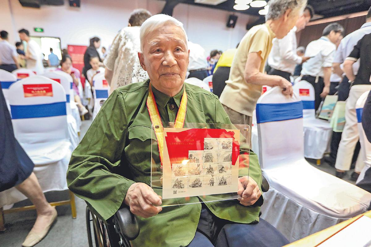 在上海四行倉庫抗戰紀念館隆重舉行的發行儀式上,主辦方向抗戰老戰士及家屬等贈送了紀念郵品。 □許雨舟 攝影報道