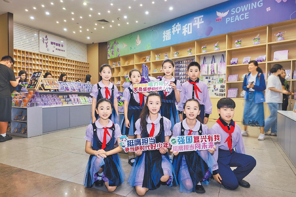 9月3日下午,江蘇省郵政分公司聯合侵華日軍南京大屠殺遇難同胞紀念館舉辦抗戰勝利80周年紀念郵票發行儀式。圖為在活動現場表演節目的學生代表來到和平郵局打卡留念。□柏濱豐 攝影報道