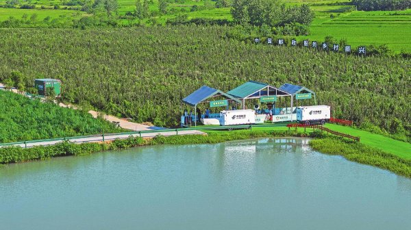 8月21日,在安徽省六安市霍邱縣元圩瓜果種植專業合作社,郵政無人車在拉運郵政電商直播賣出的秋月梨(無人機照片)。