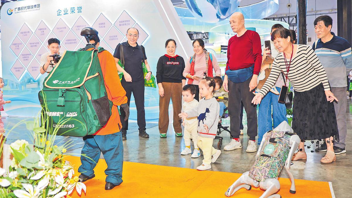 在博覽會郵政展臺前,廣西郵政推出的機器人、機器狗與觀眾友好互動。