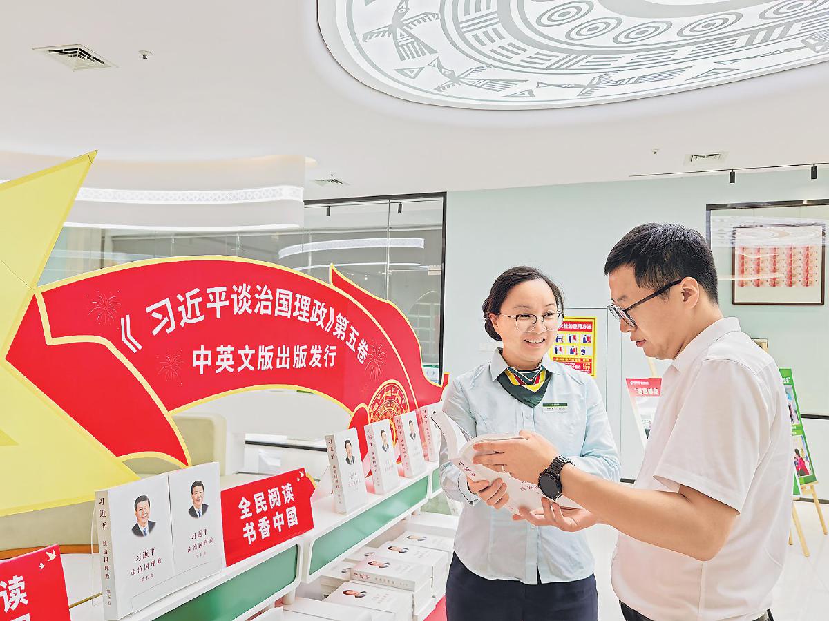 近日,走進廣西壯族自治區南寧市金浦路郵政支局,一抹鮮艷的紅色映入眼簾,紅色背景的展板下,整齊排列著《習近平談治國理政》第五卷圖書。不少讀者在此駐足,有的神情專注地翻看,有的在聆聽工作人員介紹。市民張先生在選購圖書的人群里格外顯眼,他不僅自己購買,還打算幫家人和朋友代買。他表示,自己是一名黨員,《習近平談治國理政》第五卷圖書對提升黨性修養和理論素養大有裨益。“在郵政網點能夠買到正版重點圖書,十分方便,工作人員很貼心地向我介紹圖書的信息。”張先生說。
