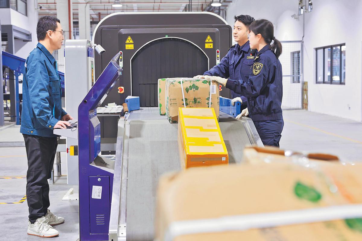 蘇州郵政配備與海關聯網的同屏比對系統,通過網業聯動,做好承運商運能的分配和管控,持續提升蘇州及其網絡輻射區域出口郵件的通關效率,幫助跨境電商企業提升海外市場競爭力。同時,海關與郵政通過物理隔離、分區作業等措施加強對郵件的監管,確保郵件安全。圖為郵政與海關人員在蘇州國際郵件互換局對國際郵件進行過機安檢。