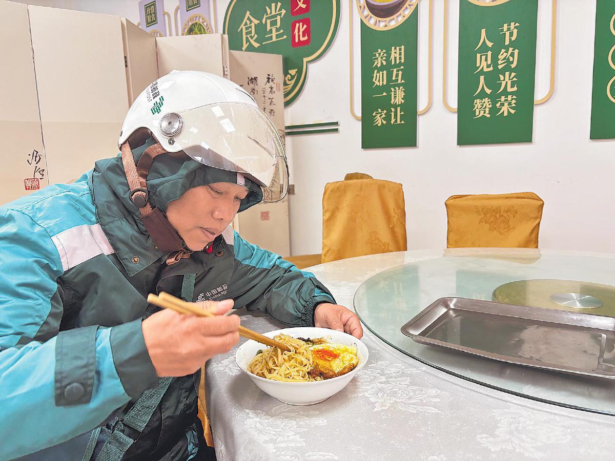 趕著投遞的攬投員在回班間隙,吃上了暖胃又暖心的熱面條。□冉俊 攝