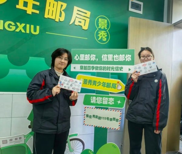 景秀高級中學將一間教室打造成了一家小型郵局——門口卡通造型的“郵筒弟”也已經正式“上崗”迎客。郵局內的陳列柜里整齊擺放著融入校園元素的毛絨玩具、冰箱貼等文創產品,書寫區同學們排起長隊,認真書寫著對親友的真摯情誼,蓋章臺邊一個個紀念戳在信封上留下獨特印記,熱鬧而溫馨的場景盡顯書信文化的魅力。