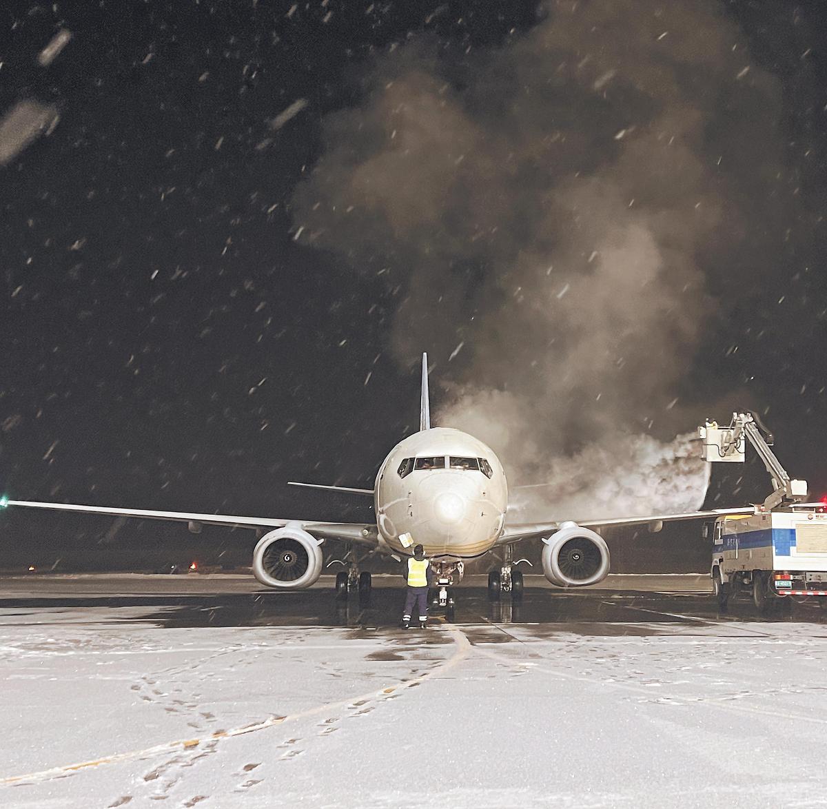1月29日深夜,郵航機務人員在新疆石河子花園機場指揮除冰車噴灑除冰液,保持飛機適航狀態。1月4日,石河子至南京“極速鮮”航線開通,助力當地軍墾農牧產品走向全國。面對冬季的寒冷與降雪,郵航機務團隊克服天氣影響,以專業維護確保航班不受低溫影響,守護著連接牧場與市場的“空中橋梁”。