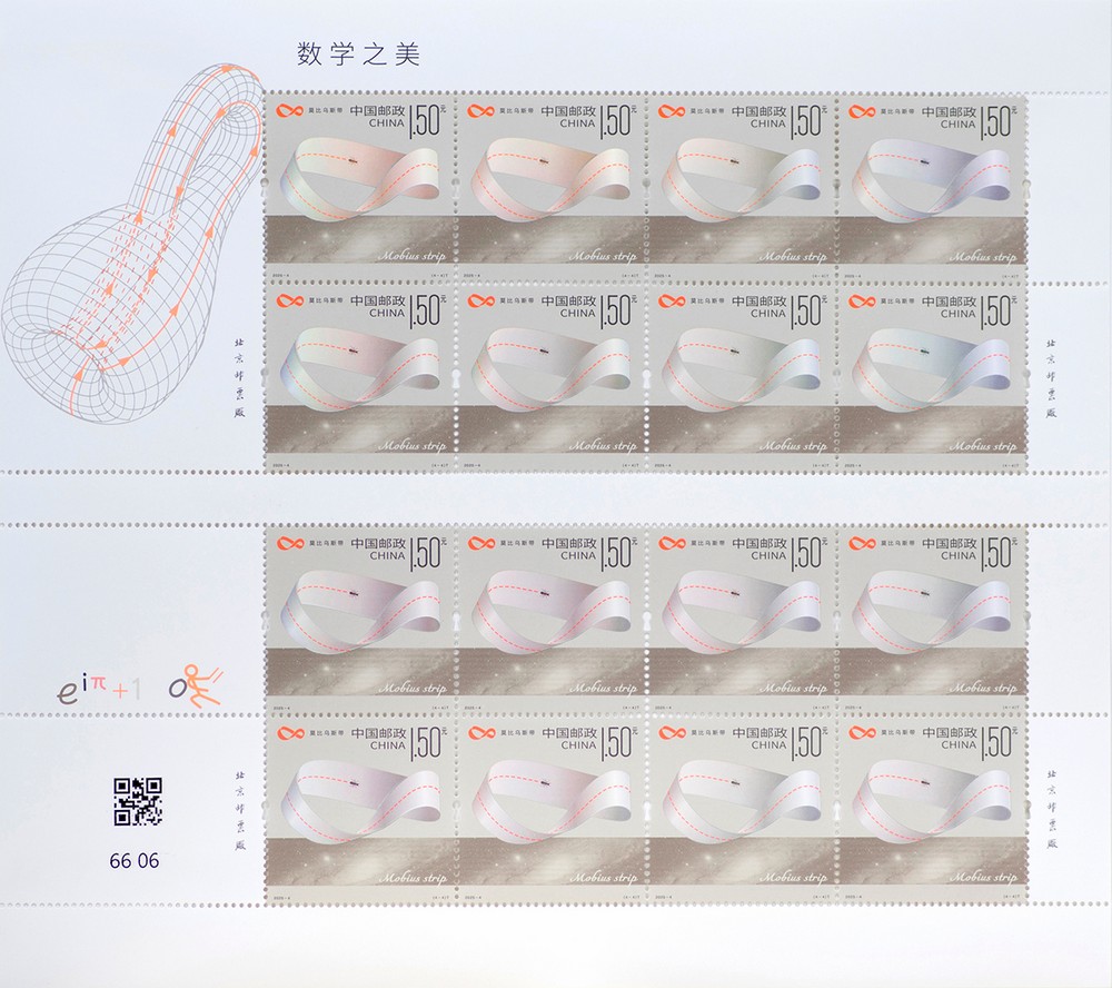 該套郵票設計語言現代,使人眼前一亮。第一枚“圓周率”作為廣為人知的數學常數,貫穿于幾何、物理等眾多學科。郵票元素包含了π的本質定義,以極細線表現早期經典割圓法,并將圓周率小數點后996位以縮微文字的方式呈現于畫面,特別通過橘色設計突出前7位,紀念我國南北朝時期數學家祖沖之。第二枚“勾股定理”是中國古代幾何學的成就之一。它給出了直角三角形三邊的長度關系,即任意一個直角三角形的兩條直角邊長度平方之和等于斜邊長度的平方。郵票在局部采用燙印工藝,以分層的視覺形式展現了證明過程。第三枚“歐拉公式”(e +1=0)被譽為“數學中最美的公式之一”,郵票以圖形的方式表現了歐拉公式將數學中5個重要常數(e、i、π、1、0)聯系起來。歐拉之眼圖案部分采用縮微工藝,將這5個常數與防偽技術相結合。第四枚“莫比烏斯帶”作為一種神奇的拓撲圖形,只有一個面和一條邊界。郵票采用局部燙印工藝,豐富的色彩變幻更好地呈現莫比烏斯帶的多維性質。在紫外光照射下,螞蟻的足跡和畫面下方的銀河相呼應,寓意著從微觀逐步擴展到更廣闊的宏觀領域。