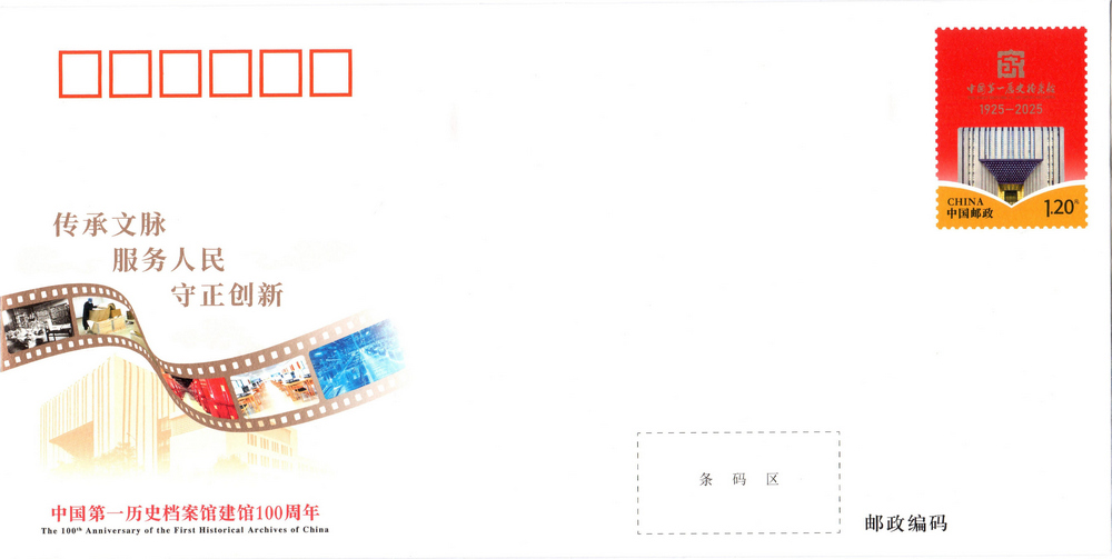 中國郵政定于2025年10月10日發行《中國第一歷史檔案館建館100周年》紀念郵資信封1套1枚。詳情如下: