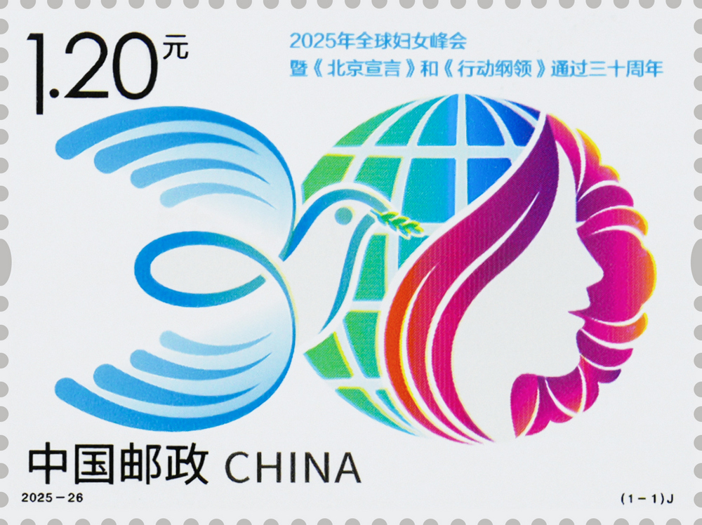 1995年,中國承辦了聯合國第四次世界婦女大會,會議通過的《北京宣言》和《行動綱領》,成為全球性別平等事業的里程碑。30年前,北京見證了世界婦女追求平等的決心。30年后,各方將再次聚首北京,共商全球婦女事業發展大計。期待看到更多女性人生出彩、夢想成真。郵票圖案以女性剪影、牡丹花、地球、和平鴿等為主要構成元素,組成“30”字樣;粉紅色的牡丹花象征溫柔與堅韌的女性力量,同時寓意峰會在中國召開;淺藍色的和平鴿代表合作、穩定與和諧;藍綠色相間的地球象征在綠色科技的推動下,全球平等發展,體現了《北京宣言》和《行動綱領》的豐富內涵。